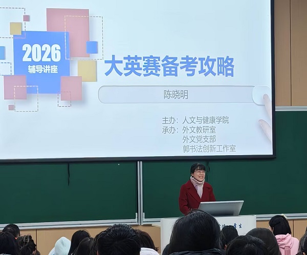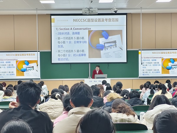 2026年全国大学生英语竞赛(NECCS)初赛将于4月12日举行。我校学子参赛热情高涨,报名参赛人数近1600人。为帮助学生精准把握竞赛题型、系统提升英语综合素养与应试能力,3月17日晚,人文与健康学院外文教研室在T3教室举办“2026年全国大学生英语竞赛(NECCS)辅导讲座”,吸引全校200多名同学到场聆听。