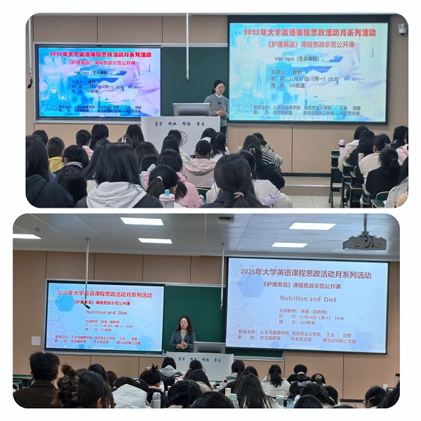 11月17日和24日,人文与健康学院外文教研室在理论教学楼成功举办了两场《护理英语》课程思政示范公开课。示范公开课以“Vital Signs(生命体征)”和“Nutrition and Diet(营养与饮食)”两大护理核心为主题,通过曹静、姚蓓两位授课教师的创新实践,生动展现了通识课程与思政教育深度融合的教学艺术,人文与健康学院及护理学院部分教师参加了现场观摩。