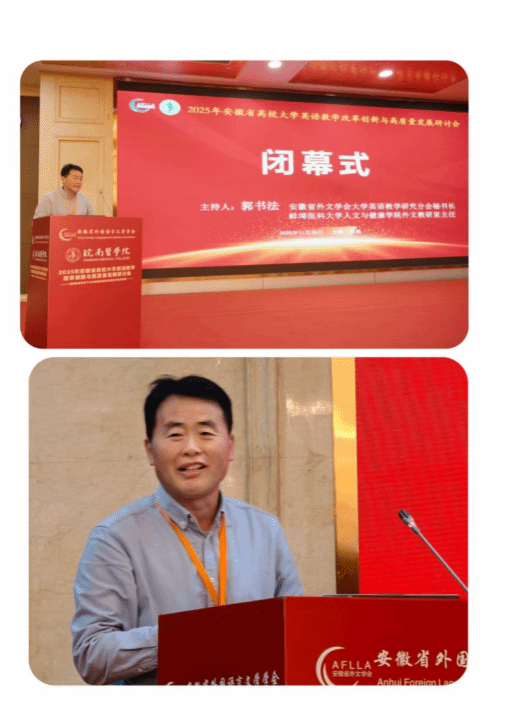 11月28日至30日,由安徽省外国语言文学类专业合作委员会与安徽省外国语言文学学会联合主办、安徽省外国语言文学学会大学英语教学研究分会和皖南医学院联合承办的“2025年安徽省高校大学英语教学改革创新与高质量发展研讨会”在芜湖隆重召开。来自全省各高校外国语学院(系)负责人、大学英语教学骨干及相关领域专家学者齐聚一堂,围绕 "数智融合背景下大学英语教育范式转型与生态构建" 主题共话教学改革新路径。我校人文与健康学院外文教学团队积极组织教师参会。