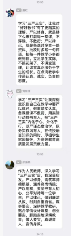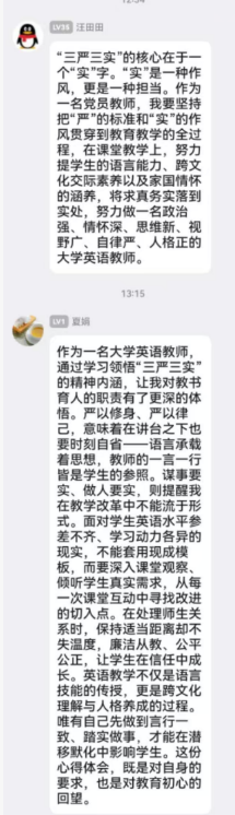 2014年3月9日,习近平总书记在参加安徽代表团审议时首次提出“三严三实”重要论述,这是党的领导干部的为官之道和行为准则,也为做好新形势下干部工作提供了重要遵循。4月4日,外文党支部开展线上学习研讨活动,党员共话学习体会。支部书记郭书法同志:严以修身、严以用权、严以律己;谋事要实、创业要实、做人要实,2014年3月9日,习近平总书记在参加安徽代表团审议时提出的“三严、三实”,是党的领导干部的为官之道和行为准则,为做好新形势下干部工作提供了重要遵循。“三严三实”,言简意赅、内涵深刻,阐明了党员干部的修身之本、为政之道、成事之要,丰富了管党治党的思想理念,为加强党员干部的党性修养深入推进新形势下的党的建设提供了重要遵循。三严三实”涵盖修身用权律已、谋事创业做人等多个方面,蕴含着严肃的政治原则和严明的纪律要求,蕴含着一切从实际出发、实事求是的思想路线,体现了世界观和方法论的有机统一、内在自律和外在约束的有机统一。作为党员教师,我们要提升道德情操,要以“甘于清贫、乐于奉献”的精神涵养师德,做到为人师表、廉洁从教,正确处理师生关系、同事关系。面对当前新一轮英语教学改革中的难点问题,需主动担当,深入一线调研,提出解决方案。支委汪田田同志:“三严三实”的核心在于一个“实”字。“实”是一种作风,更是一种担当。作为一名党员教师,我要坚持把“严”的标准和“实”的作风贯穿到教育教学的全过程,在课堂上努力提升学生的语言能力、跨文化交际素养以及家国情怀,将求真务实落到实处,努力做一名政治强、情怀深、思维新、视野广、自律严、人格正的大学英语教师。支委夏娟同志:通过学习领悟“三严三实”的精神内涵,我对教书育人的职责有了更深的体悟。严以修身、严以律己,意味着讲台之下也要时刻自省——语言承载思想,教师的一言一行皆是学生的参照。谋事要实、做人要实,则提醒我在教学改革中不能流于形式。面对学生英语水平参差不齐、学习动力各异的现实,不能套用现成模板,而要深入课堂观察、倾听学生真实需求,从每一次课堂互动中寻找改进的切入点。英语教学不仅是语言技能的传授,更是跨文化理解与人格养成的过程。唯有自己言行一致、踏实做事,才能在潜移默化中影响学生。教师党员刘佳佳教授:学习“三严三实”让我深刻意识到,教学中要严以律己、踏实认真,备课授课不敷衍,用实际行动教书育人,把“三严三实”内化于心、外化于行,以严谨态度治学,以务实作风育人,在传授语言知识的同时厚植学生家国情怀,为高等教育高质量发展贡献力量。